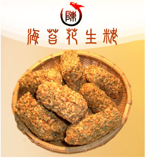 海苔花生老(麻粩)是以酥脆米果裹上手工麥芽糖,再沾上麻油此事嚴選酥脆海苔及花生角製作而成,風味獨特。