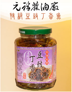 特級豆鼓丁香魚(豆鼓朝天小魚)為嚴選小魚與辣椒爆香後,再以豆豉一起釀製,為下酒拌麵最佳輔佐食品。